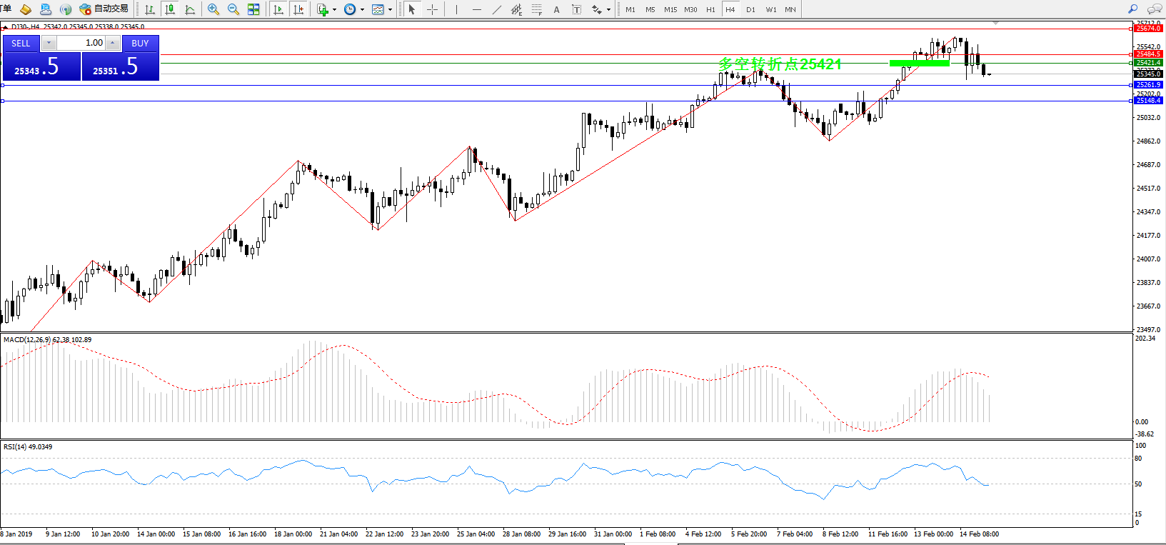 道琼斯指数DJ30——4小时K线图显示: