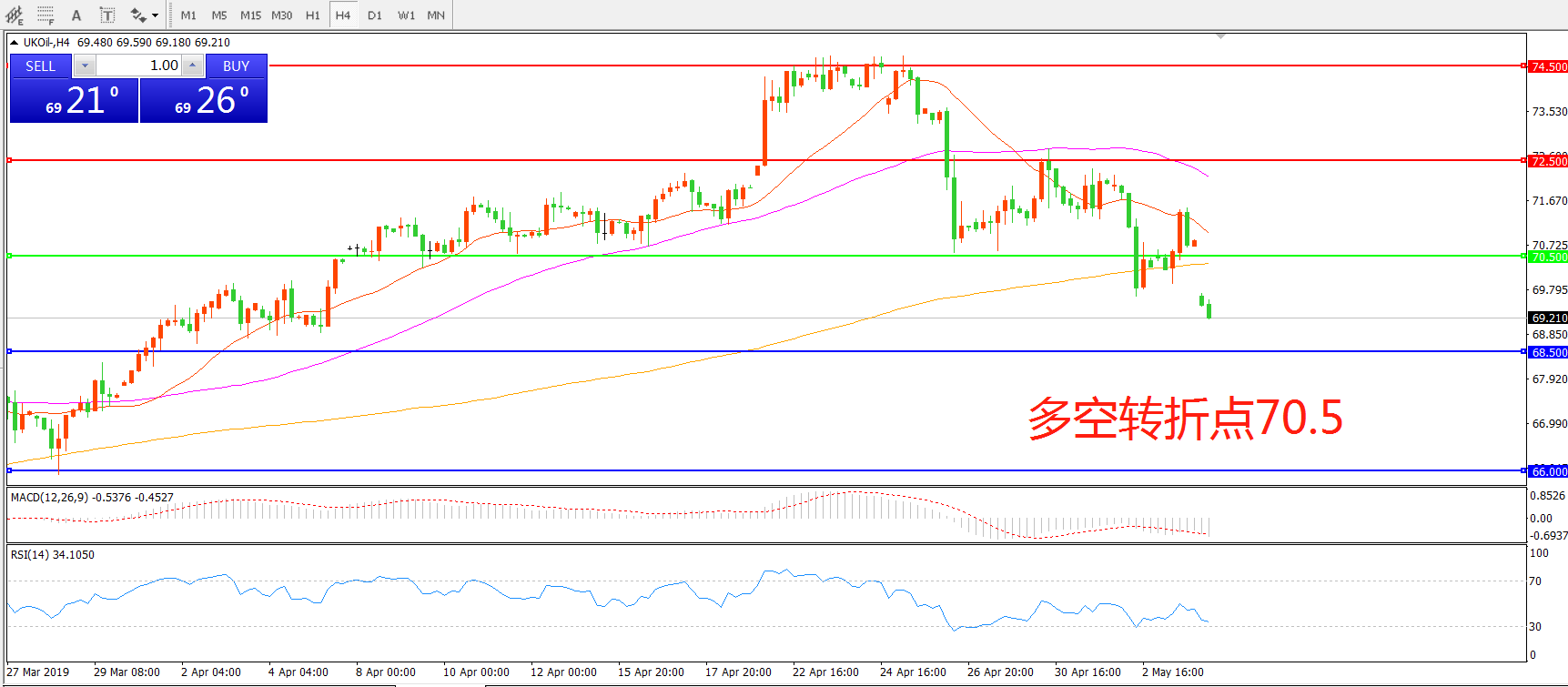 虽然沙特等国依然在稳步推进减产行动,但美国原油产量再创纪录新高依然令多头信心受挫,同时伊朗局势的不确定性令油价走势挣扎。 业内消息人士表示,美国再次对伊朗实施制裁已使伊朗原油出口量减少一半以上,降至每日100万桶或更低,但彻底零封的难度较大。而俄罗斯方面因通往欧洲地区的出口管道存在被污染问题,未来数日内产量可能至多将减少10%, 由于特兰普推特消息冲击影响,周一早间全球市场陷入一片混乱。其中国际油价持续走低,布伦特原油跌2%,创4月5日以来新低,截止发稿前收现报69.00美元/桶