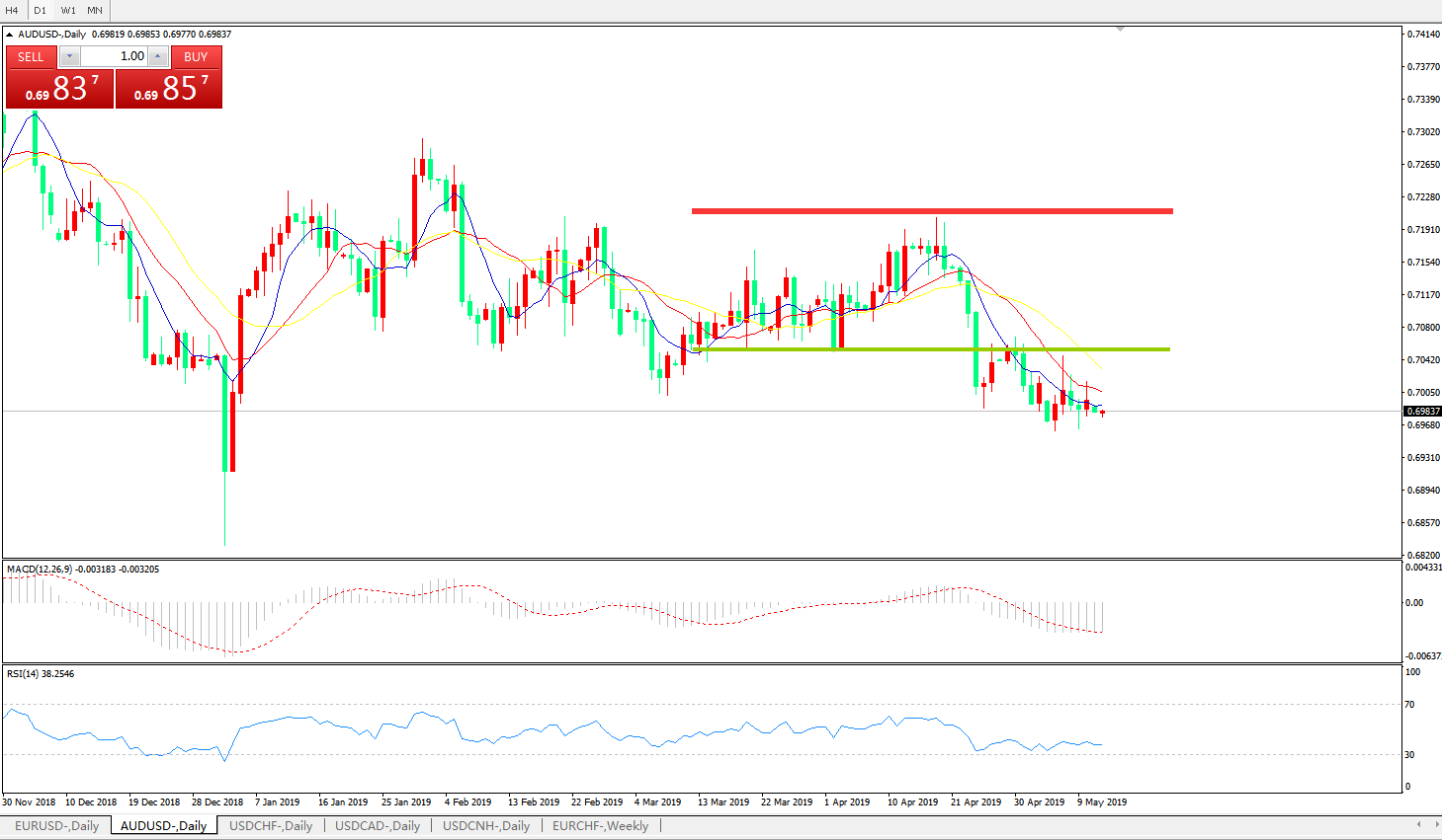 技术面简析:日图均线有序空头排列看跌,汇价多空转折区域下方弱势整理,MACD下穿0轴且动能柱0轴下方放量,RSI缓步走低,预计汇价将进一步下行。