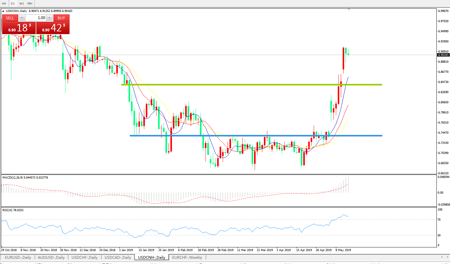 备选策略: 在6.8450之下,看跌,目标价位为6.7370,然后为6.6690 。