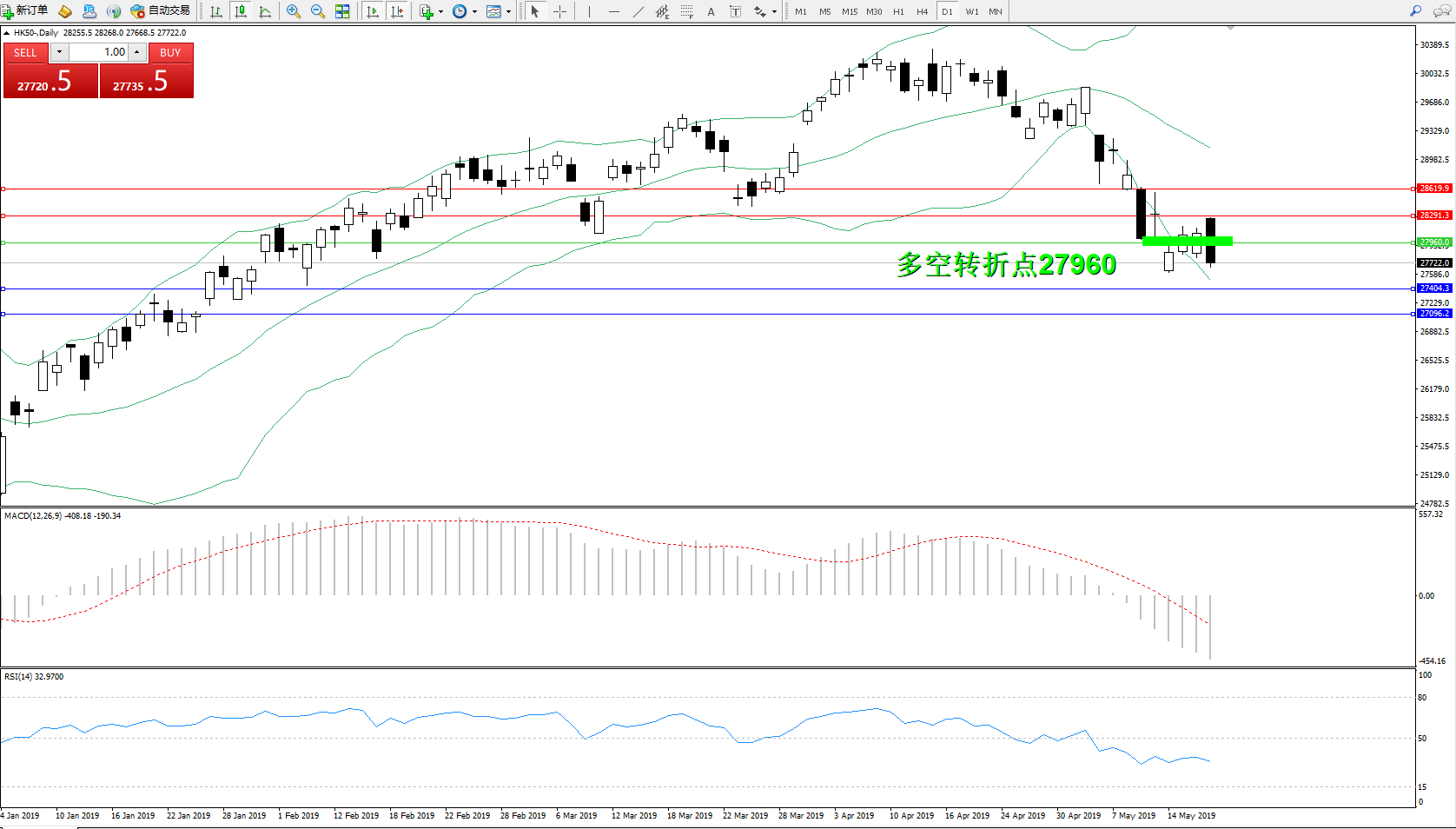 交易策略:27960下方看跌,目标27404、27096