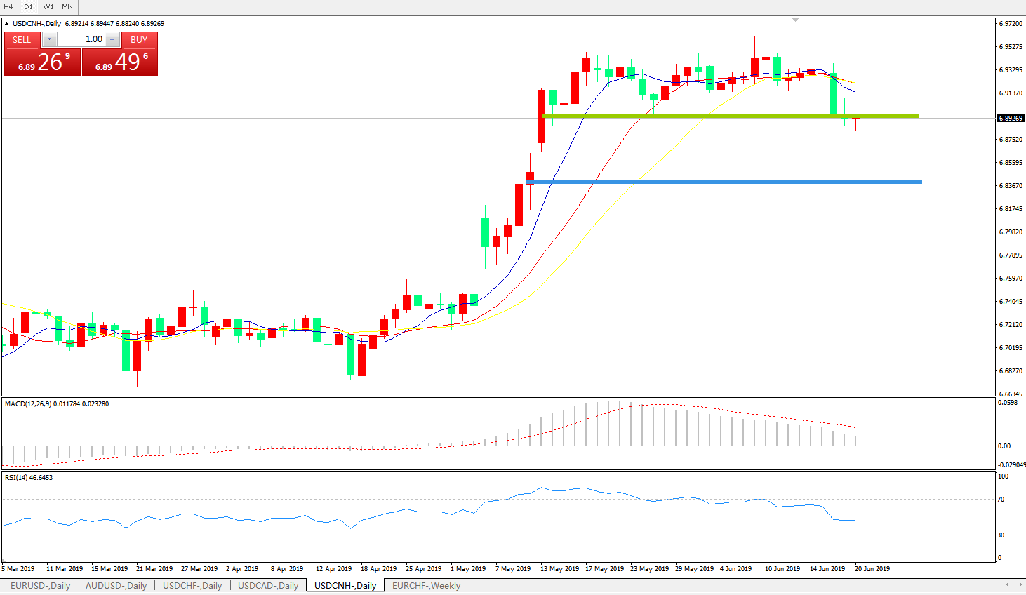 技术面简析:日线图均线有发散下行迹象,MACD在0轴上方向下运行且动能柱持续缩量,RSI逐步走低,预计短期汇价有继续回落需求,贸易争端缓解及G20是目前焦点,需持续关注。