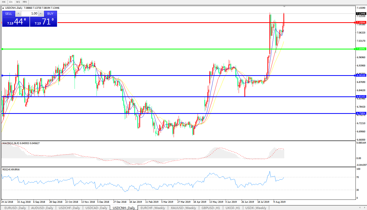 技术面简析:日图均线再度呈有序多头排列,汇价强势上攻再度逼近前高,MACD运行在0轴上方且动能有再度放量迹象,RSI再度升入超买区域,预计汇价将维持攻势,重点关注7.20-7.30区间的压制;中美贸易战升级,短期汇价波动率急剧上升。