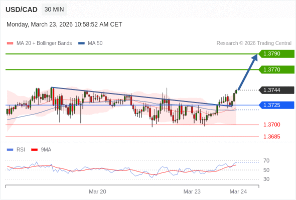 在 1.3725 之上,看涨,目标价位为 1.3770 ,然后为 1.3790 。