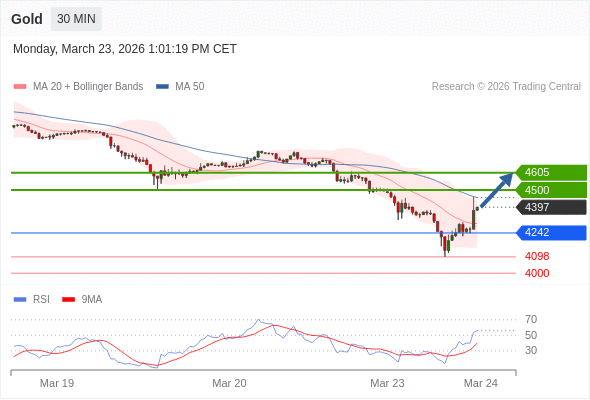 交易策略: 在 4242 之上,看涨,目标价位为 4500 ,然后为 4605 。