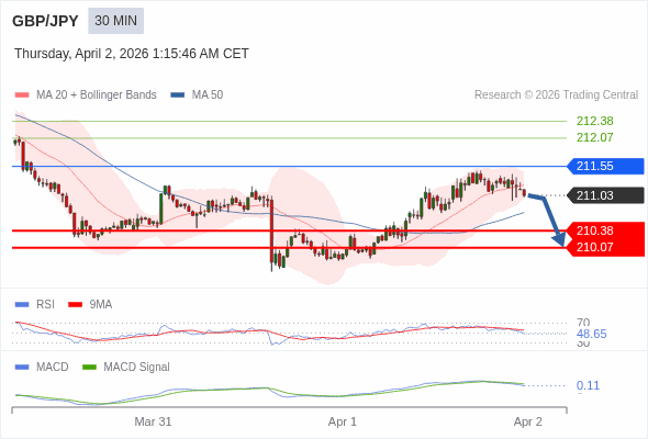 英镑/日元 当日内 : 逐渐下跌,当 211.55 阻碍上行,则 210.07 为目标位。