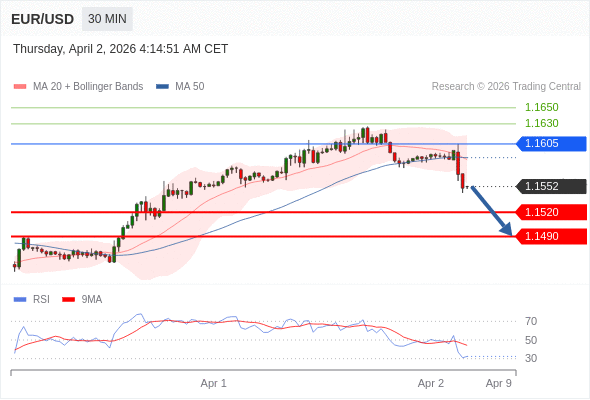 交易策略: 在 1.1605 之下,看跌,目标价位为 1.1520 ,然后为 1.1490 。