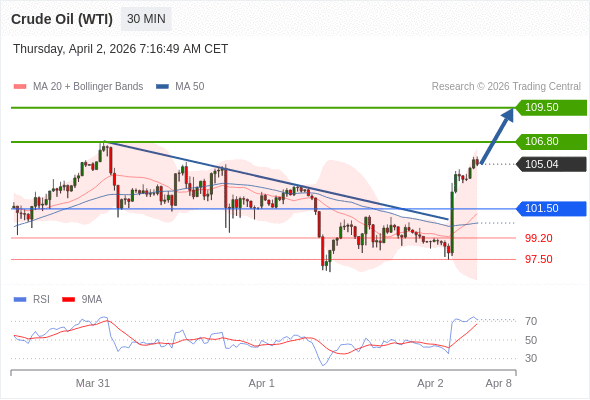 在 101.50 之上,看涨,目标价位为 106.80 ,然后为 109.50 。