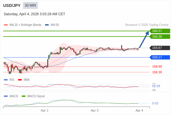 美元/日元 当日内 : 看涨,当 159.17 为支撑位。