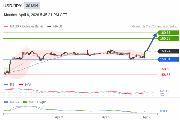 美元/日元 当日内 : 看涨,当 159.34 为支撑位。