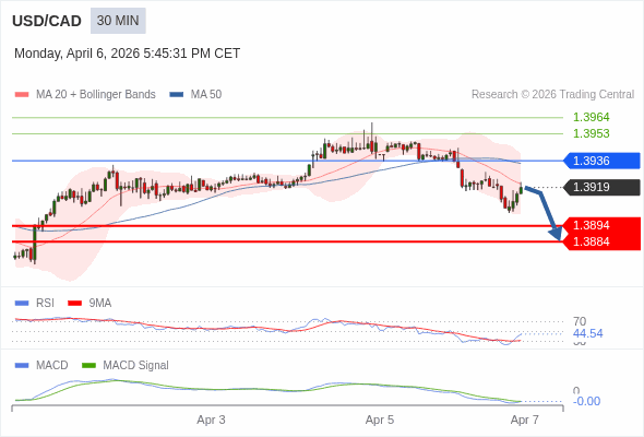 美元/加元 当日内 : 看跌,在 1.3936 之下。
