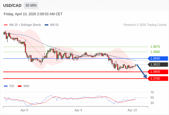 在 1.3840 之下,看跌,目标价位为 1.3800 ,然后为 1.3780 。