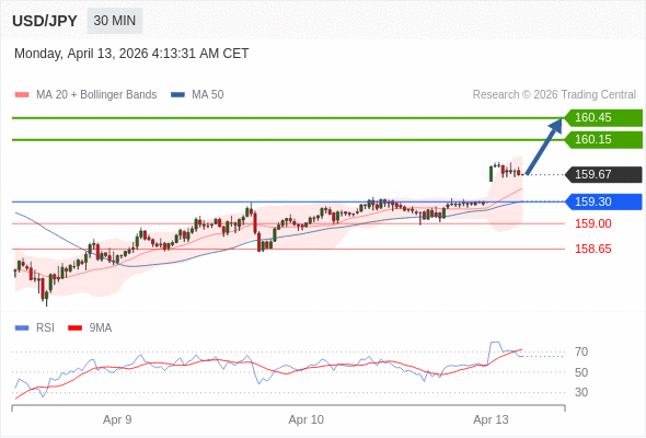 在 159.30 之上,看涨,目标价位为 160.15 ,然后为 160.45 。