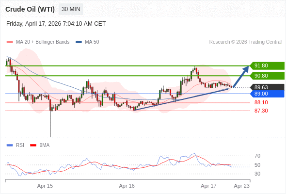 在 89.00 之上,看涨,目标价位为 90.80 ,然后为 91.80 。
