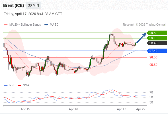 在 97.40 之上,看涨,目标价位为 99.10 ,然后为 99.80 。
