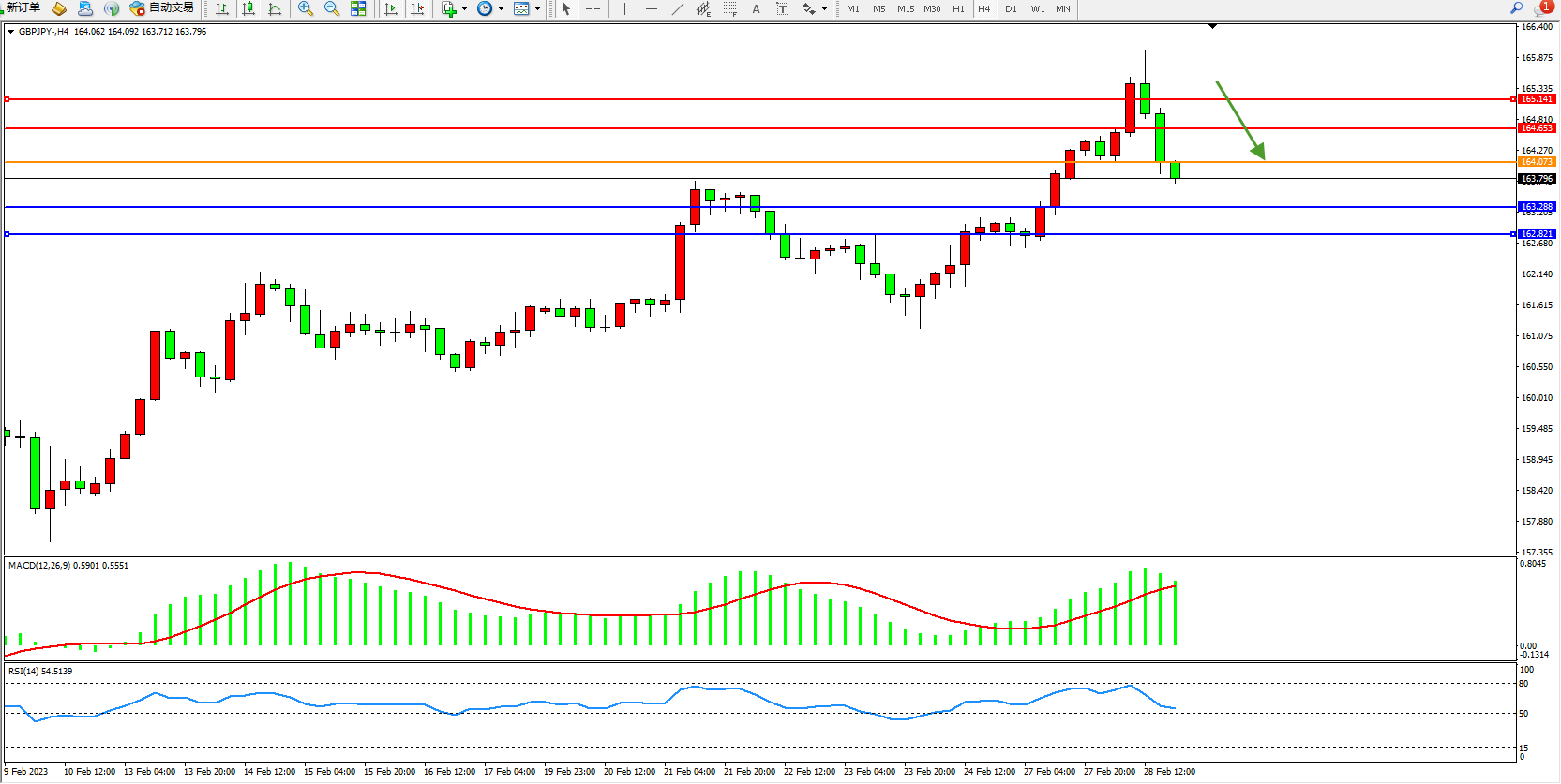 交易策略:164.073下方看跌,目标163.288、162.821