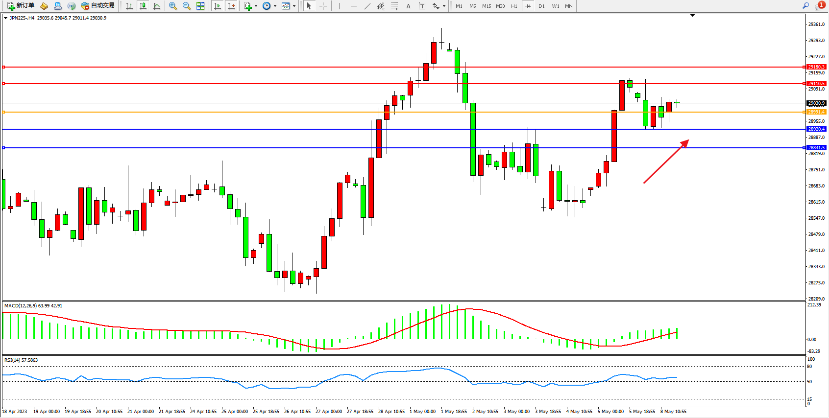 日经指数JPN225——4小时K线图显示: