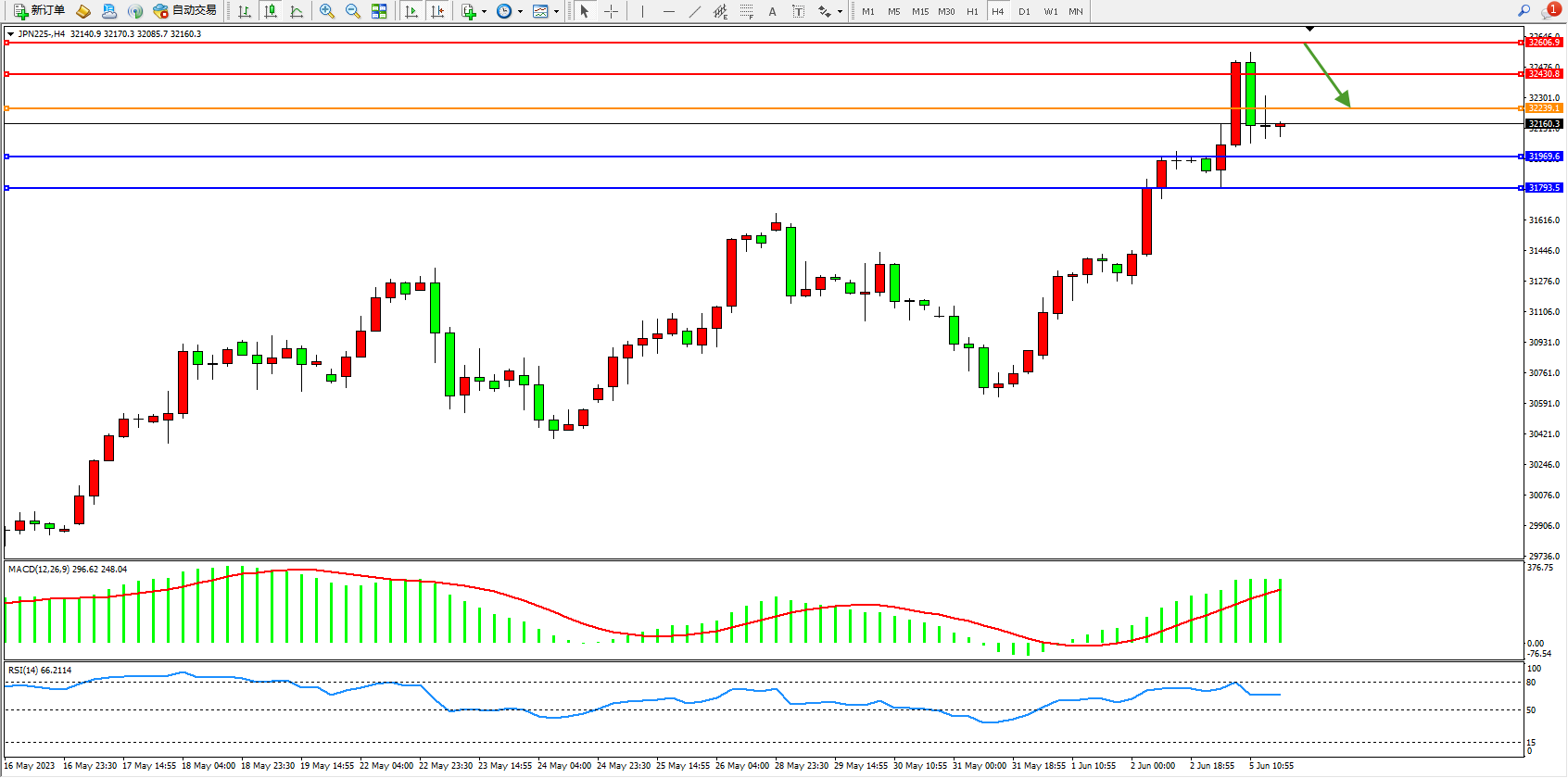 日经指数JPN225——4小时K线图显示:
