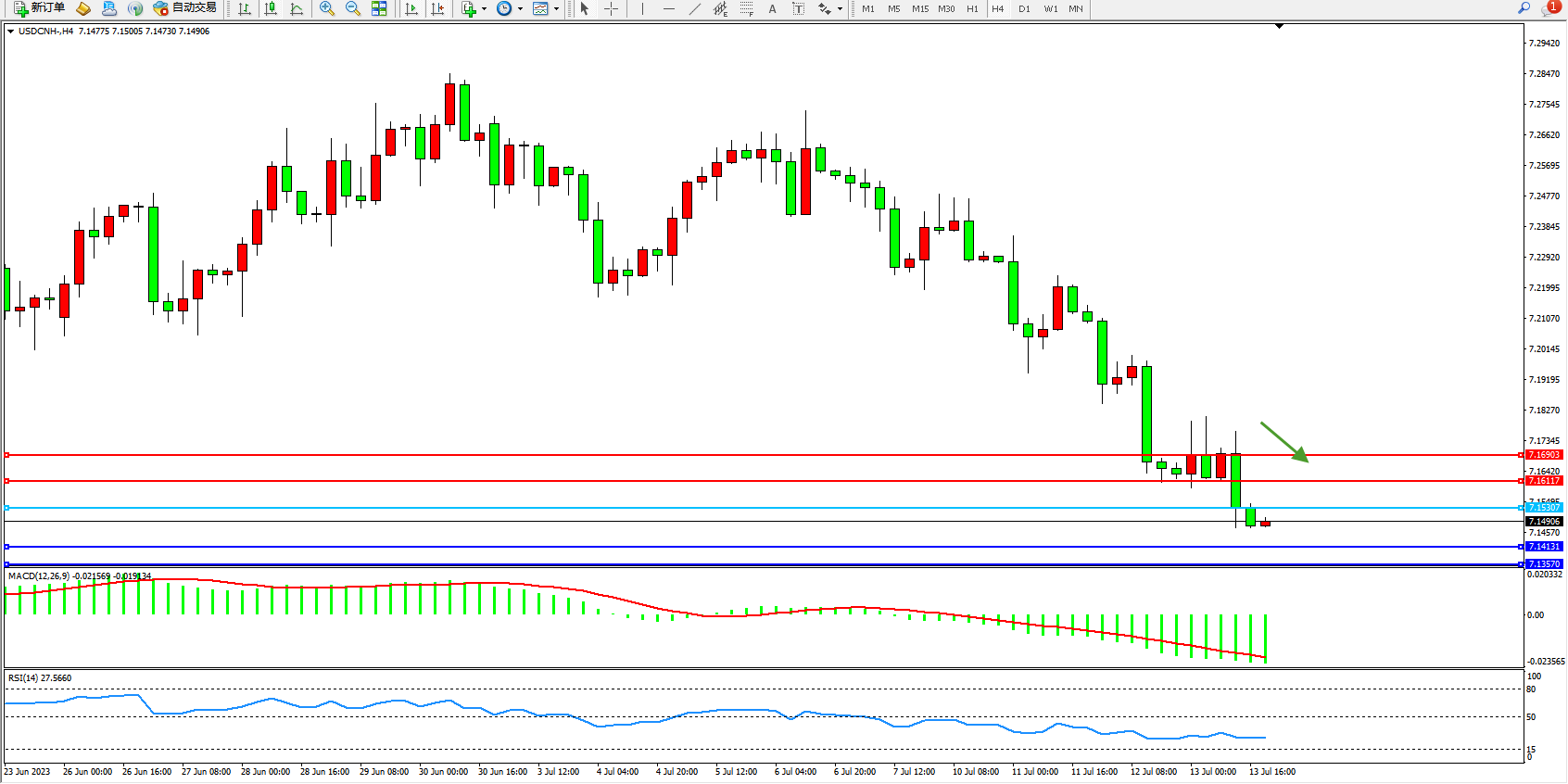 交易策略:7.15307下方看跌,目标7.14131 7.13570