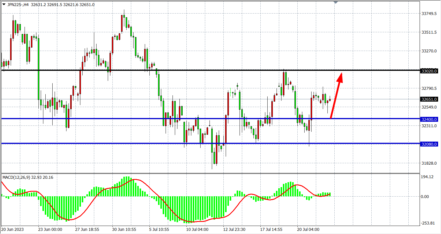4小时图看,日经指数在前低点32080附近受支撑反弹,MACD量能维持零轴之上,行情走宽幅震荡为主,阻力关注33020,支撑关注32400、32080。