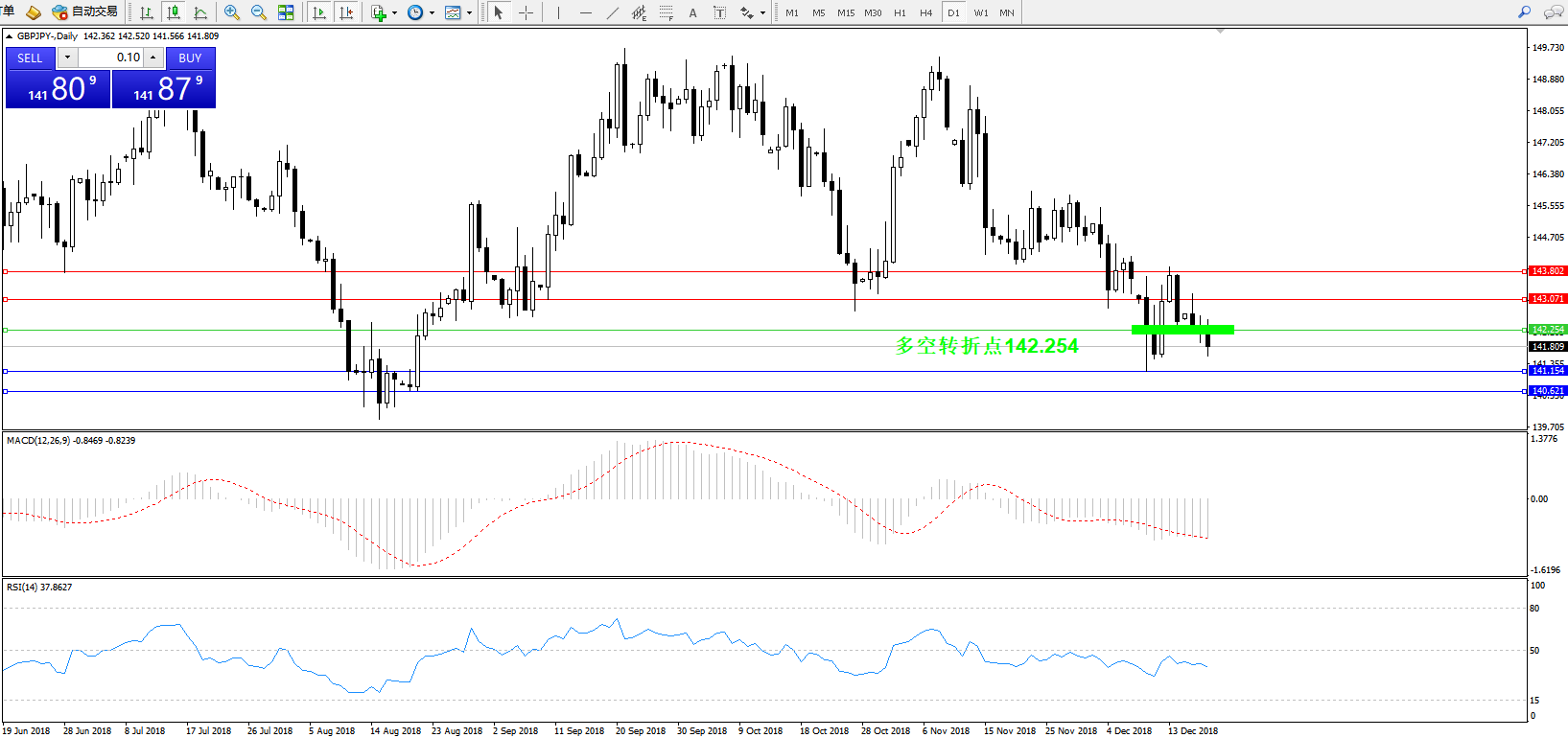 交易策略:142.254下方看跌,目标141.154140.621