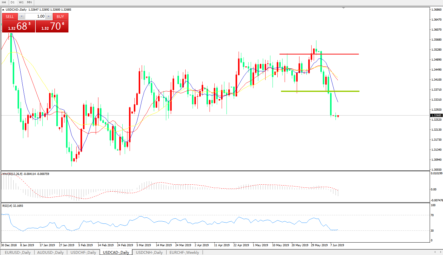 技术面简析:日线图均线呈有序空头排列,汇价大幅下跌后窄幅整理反弹乏力MACD下穿0轴且动能柱继续放量,RSI走低触及超卖区域,预计汇价大概率将延续弱势继续下行