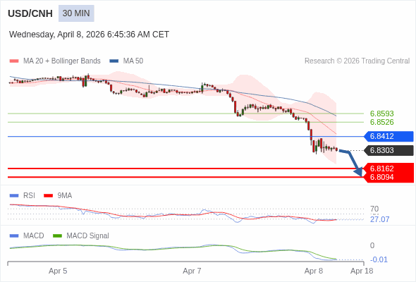 技术点评: RSI技术指标小于30。在这种情况下,说明有很强的下跌趋势,或者意味着处在超卖的状态下,可能会有向上的反弹。我们将观察RSI技术指标是否出现背离现象。 MACD技术指标处在其信号线之下看空。 配置为负。 此外,价位低于其20天及50天移动平均线 ( 分别位于6.8432 和6.8574 )。