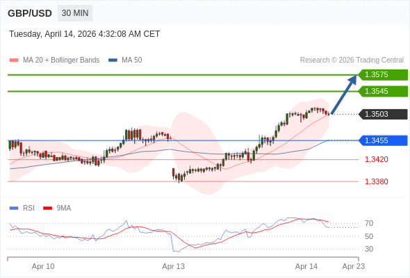 在 1.3455 之上,看涨,目标价位为 1.3545 ,然后为 1.3575 。
