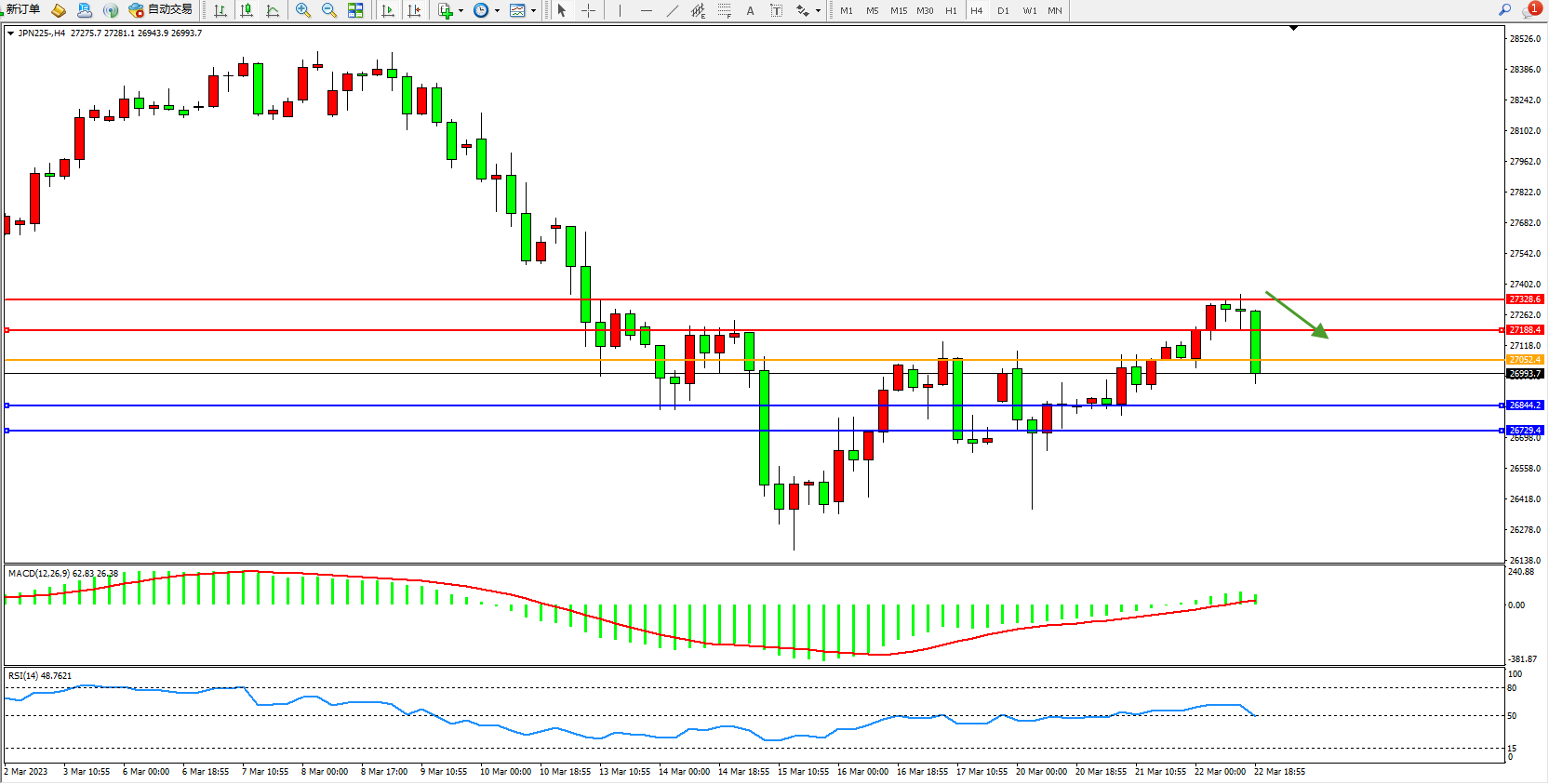 日经指数JPN225——4小时K线图显示: